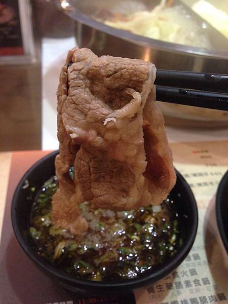 因為品質很不錯,直接吃原味也很棒,沾取特調的清爽醬汁搭配則又是另一種風味,涮過牛肉的湯鍋裡肉沫不太多,浮在上層的油金黃清澈,可ˇ看得出肉的品質有多高~