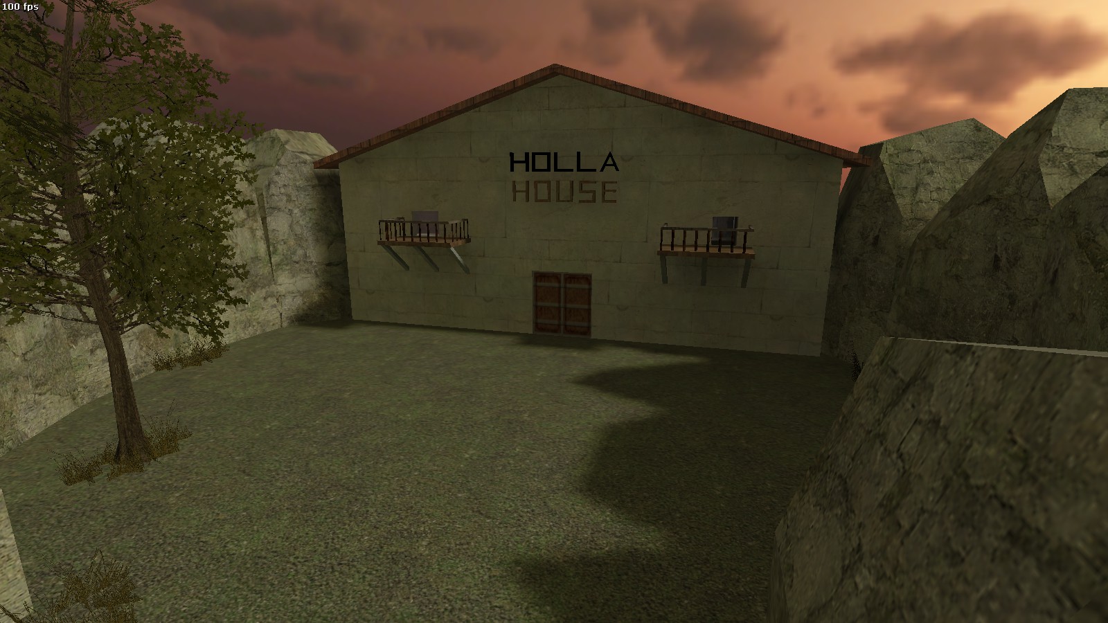 地圖的房屋特意設計成被一些小型的山峰包圍,把天空設置為日出的模樣,透過用橘色光影/日出skybox來呈現。