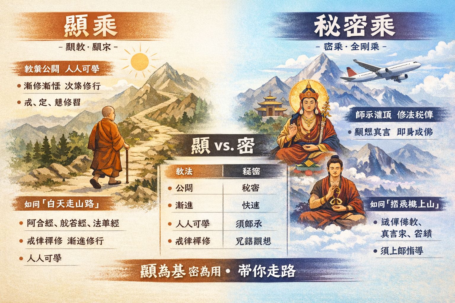 簡言之,顯乘是「因乘」,密乘是「果乘」。兩者不是對立,而是針對不同根器、不同時機的善巧法門。如同渡河:顯乘如造船、划槳,穩健但需時;密乘如直接乘風帆或橋樑,快速但需更多準備與信心。