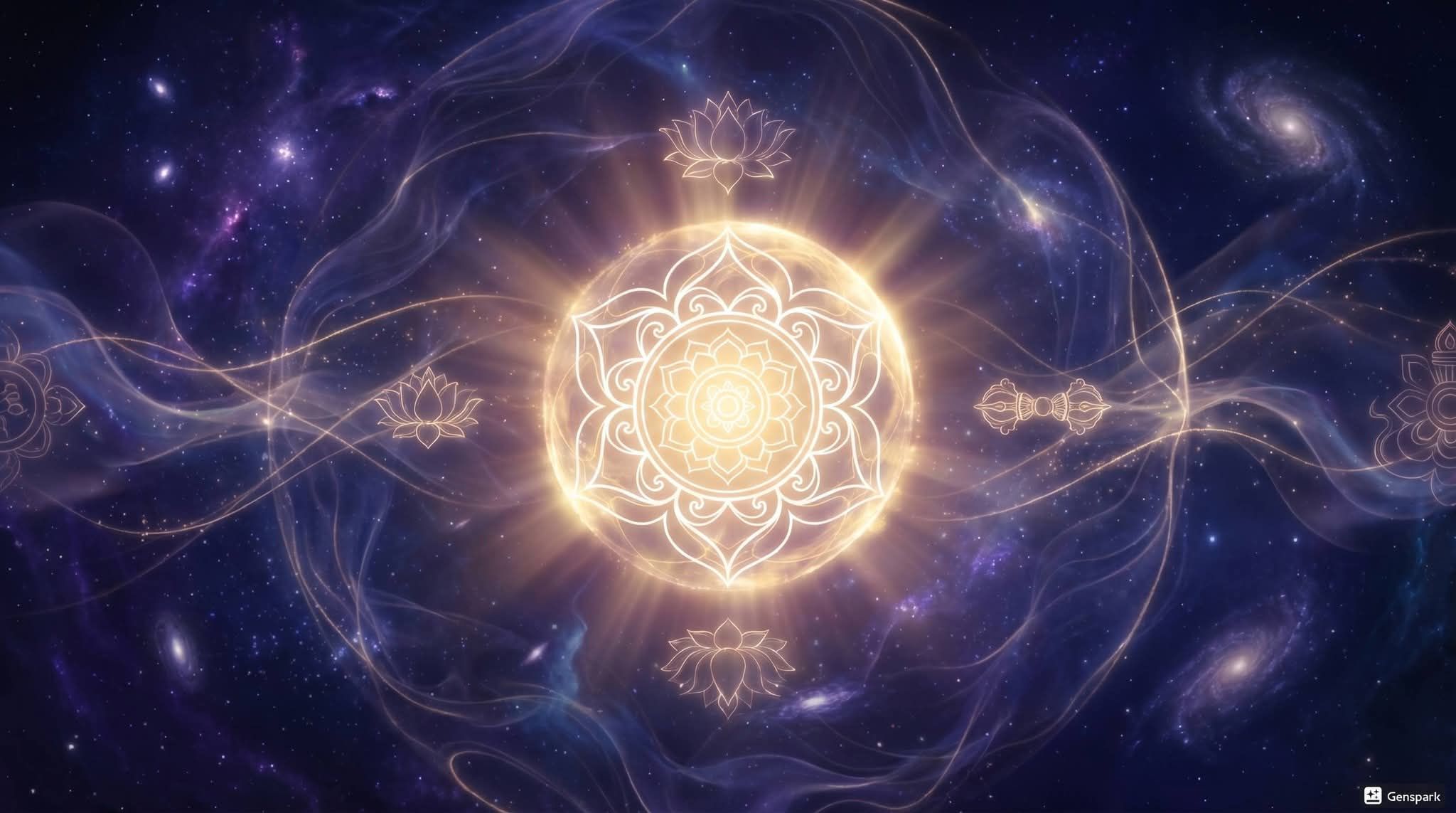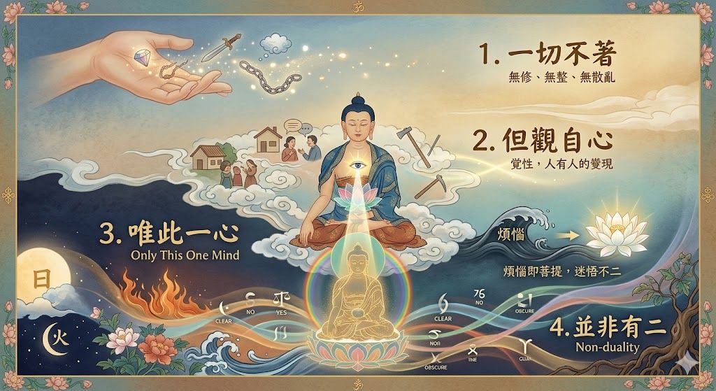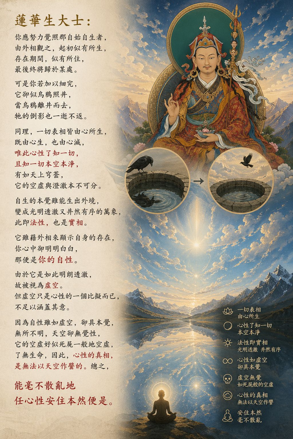 蓮華生大士:你應努力覺照那自始自生者, 由外相觀之,起初似有所生, 存在期間,似有所住,最後終將歸於某處。 可是你若加以細究,它卻似烏鴉照井, 當烏鴉離井而去,牠的倒影也一逝不返。 同理,一切表相皆由心所生, 既由心生,也由心滅, 唯此心性了知一切,且知一切本空本淨,有如天上穹蒼,它的空虛與澄澈本不可分。 自生的本覺雖能生出外境, 變成光明透澈又井然有序的萬象, 此即法性,也是實相。 它雖藉外相來顯示自身的存在, 你心中卻明明白白,那便是你的自性。 由於它是如此明朗透澈,故被視為虛空。 但虛空只是心性的一個比擬而已, 不足以涵蓋其意。 因為自性雖如虛空,卻具本覺,無所不明,天空卻無覺性,它的空虛好似死屍一般地空虛,了無生命,因此,心性的真相,是無法以天空作譬的。總之,能毫不散亂地任心性安住本然便是。自性本空,它真的無實無根,你的自性也如虛空,你不妨仔細觀照一下自心是否確實如此。你真的不用先入為主地秉持著空觀,那自然生起的本覺,從無始以來一直空明朗淨,好似太陽一般,由核心自然發出光熱,你不妨仔細觀照一下自心是否確實如此。這本覺本智,真的是不滅的,好似江河流水一般永無止盡,你不妨仔細觀照一下自心是否確實如此。心念變化無常,真的不是我們的憶念所能理解,它們就像微風一般難以捉摸,你不妨仔細觀照一下自心是否確實如此。不論任何外境生起,真的就是本體顯現,就像明鏡能反映出一切外境似的。世上紛紛萬象,真的都在它的自身內解脫,就像空中的雲彩自行生出又自行寂滅,你不妨仔細觀照一下自心是否確實如此。大圓滿1. 一切不著(Non-attachment to All)深層含義:不僅是外在物質的捨棄,更核心的是對心念、情緒、概念、執著(能執與所執)的放下。這意味著「無修、無整、無散亂」的狀態,不需要刻意去造作一個「清淨」的境界,也不要刻意去剷除煩惱。修持點:在日常生活中,順應萬境轉動,但不在其中生起得失、順逆的執著。2. 但觀自心(Only Observe One's Own Mind)深層含義:「觀」不是用眼睛看,而是用本具的智慧(覺性)去照見。這是一種「直觀」,當下赤裸裸地體認心的本性——無生、清淨、光明、空寂。修持點: 安住在「無錯亂的平靜心」中,覺知當下的念頭,既不跟隨,也不壓抑,任其自起自滅。3. 唯此一心 (Only This One Mind)深層含義:大圓滿強調「心佛眾生三無差別」,即此當下的一念靈知(心性)就是佛。沒有外在的佛需要祈求,也沒有眾生需要脫離,這就是萬法的本源。修持點:體認到煩惱即菩提,迷悟不二。4. 並非有二 (Non-duality)深層含義:這是最高層次的平等不二。所謂「有」、「無」、「淨」、「垢」、「修」、「證」都是對立的觀念。超越了這些二元對立,就是「平等自在」的本來面目。這與禪宗「不二法門」相似,強調「自生自顯,本無能所」。總結這句偈語教導的是:直接認識心性的光明(「觀自心」),在煩惱當下不生貪嗔執著(「一切不著」),體認當下一念即是佛(「唯此一心」),從而證悟煩惱與涅槃原本不二(「並非有二」)。這便是蓮花生大士所傳的無染覺性直觀自行解脫之道。
